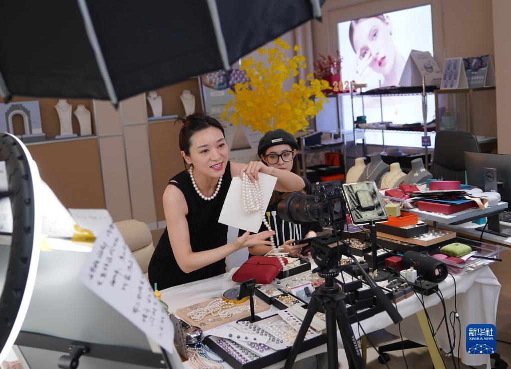 5月17日,浙江省諸暨市山下湖鎮(zhèn)一個(gè)電商直播基地,一名主播在直播中推介珍珠產(chǎn)品。