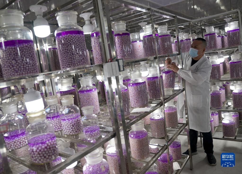 5月17日,浙江省諸暨市山下湖鎮(zhèn)一家珍珠企業(yè)的工作人員查看庫房內(nèi)進(jìn)行增亮處理的珍珠。