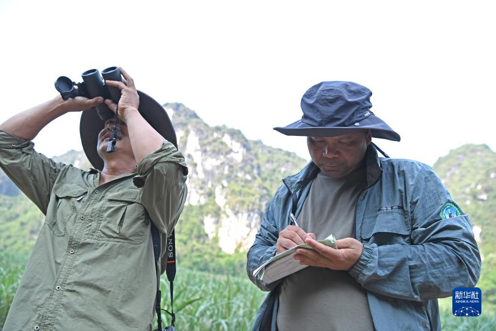 蒙育寧(右)和同事在岜盆自然保護區(qū)記錄猴群生活情況(5月18日攝)。