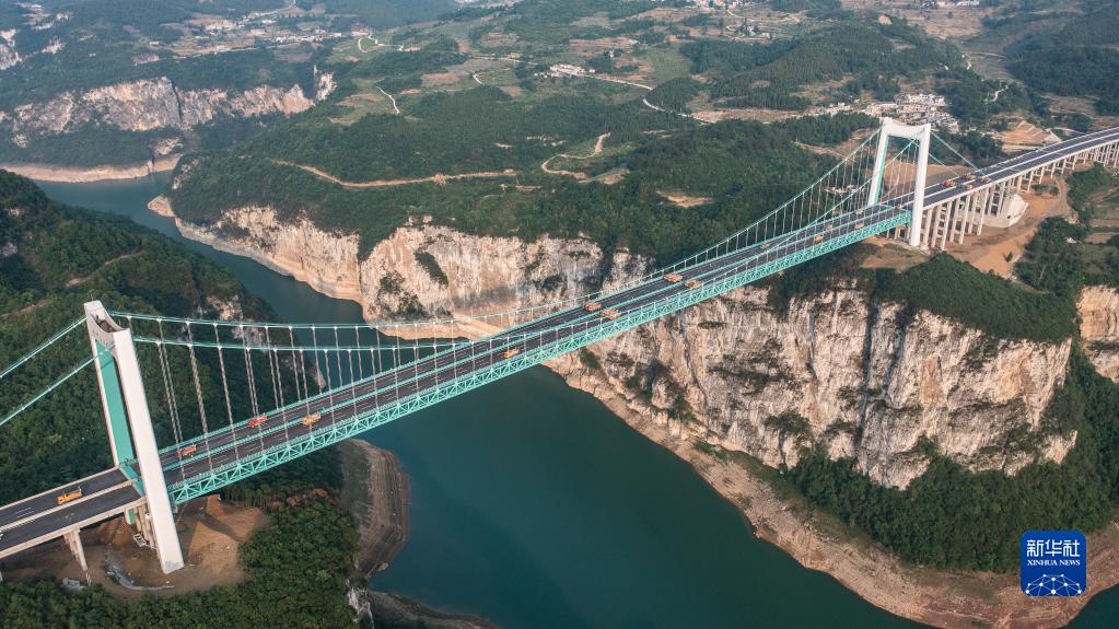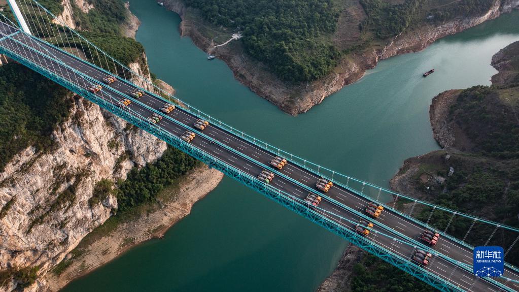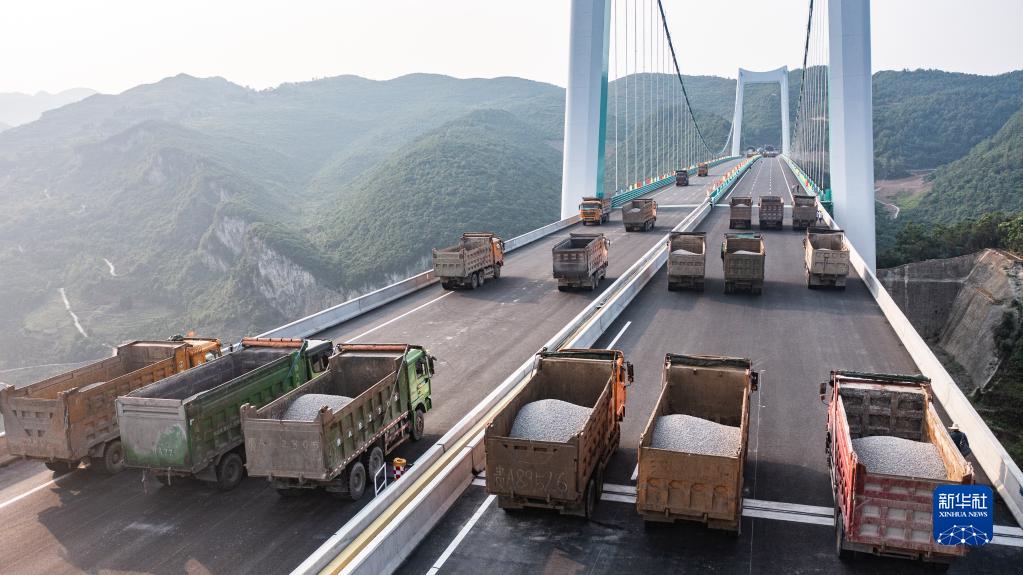 當日,由貴州路橋集團承建的金烽烏江大橋進行靜態(tài)荷載試驗,48輛負載砂石的大型貨車有序行駛到固定的位置進行對稱、偏心檢測,檢驗橋梁結(jié)構(gòu)整體的施工質(zhì)量與受力性能,為橋梁竣工驗收提供科學依據(jù)。