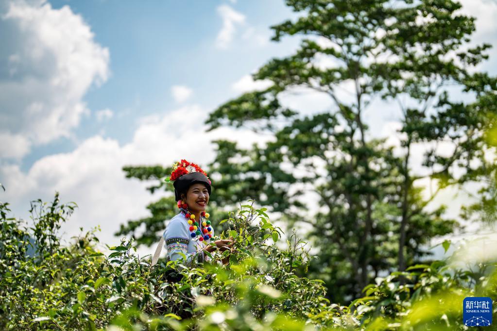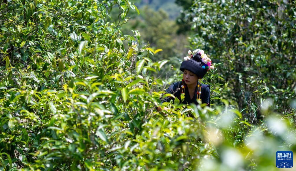 這是2023年5月17日,中國(guó)云南省勐海縣布朗山布朗族鄉(xiāng)老曼峨寨的茶農(nóng)在采茶。