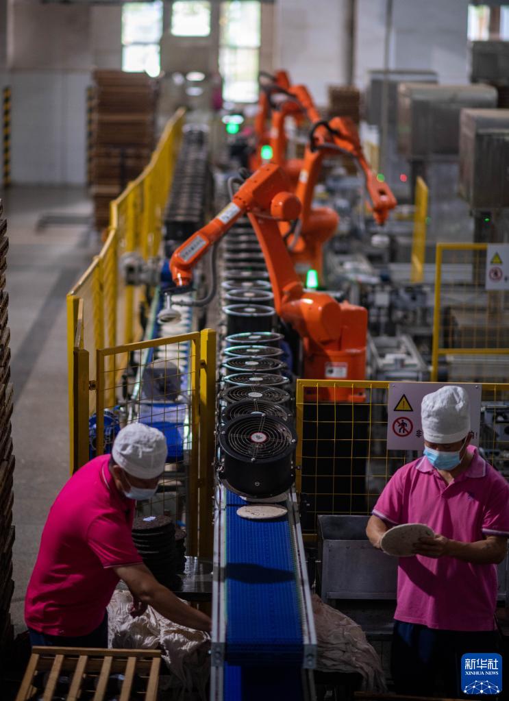 這是2023年5月18日,中國(guó)云南省勐海縣勐海茶廠的工人在自動(dòng)機(jī)械臂的協(xié)助下分揀包裝普洱茶餅。