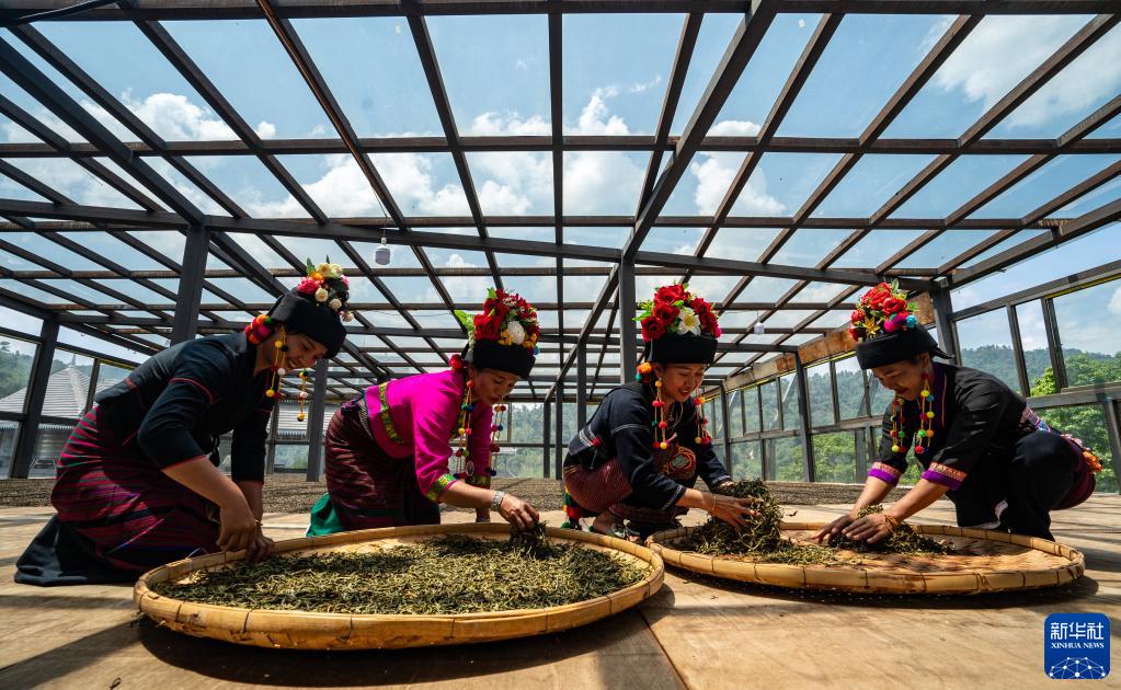 這是2023年5月17日,中國(guó)云南省勐海縣布朗山布朗族鄉(xiāng)的茶農(nóng)在晾曬茶葉。