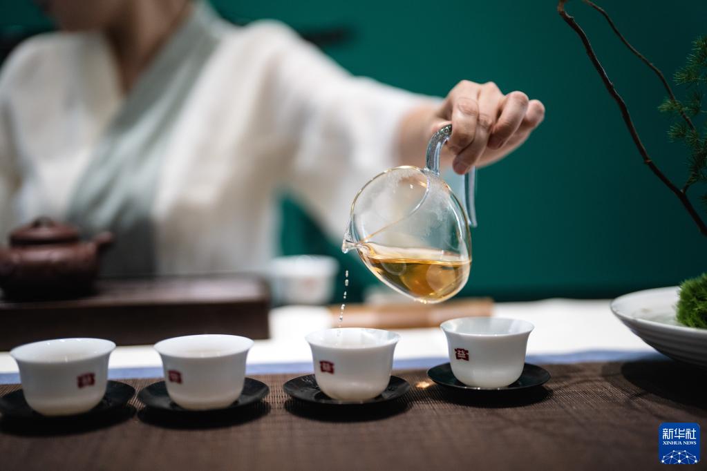 這是2023年5月18日,中國(guó)云南省勐海縣勐海茶廠的茶道師在展示茶道。