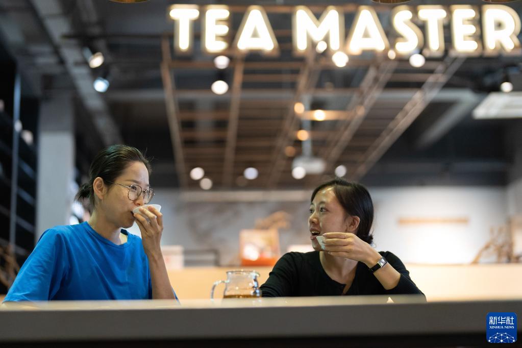 這是2023年5月18日,兩名茶客在中國(guó)云南省勐海縣一處茶館品嘗普洱茶。