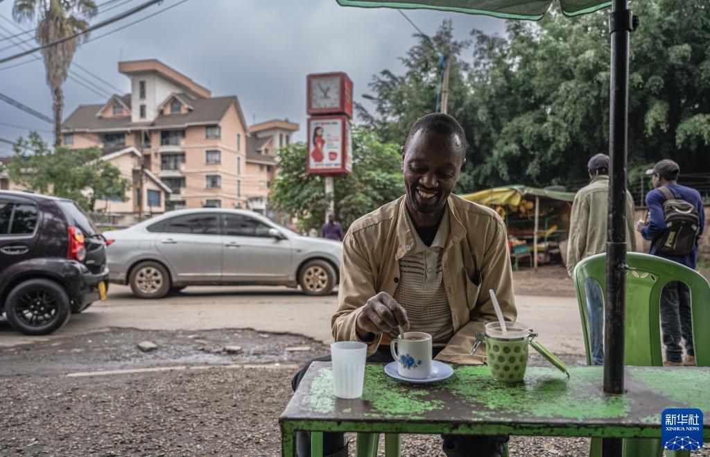 這是2023年5月17日,市民在肯尼亞內(nèi)羅畢街邊飲用奶茶。