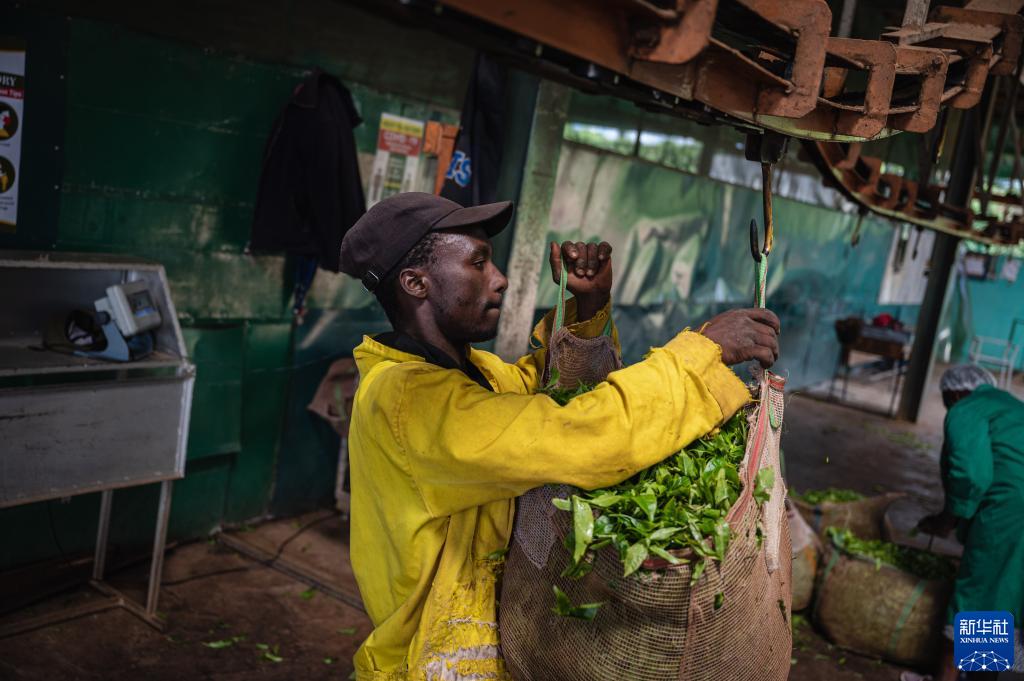 這是2023年5月4日,工人在肯尼亞首都內(nèi)羅畢附近的茶廠里搬運(yùn)茶葉。