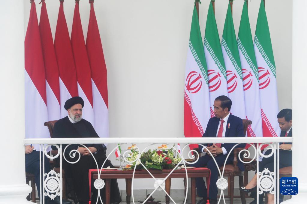 5月23日,在印度尼西亞茂物總統(tǒng)府,印尼總統(tǒng)佐科(右二)和到訪的伊朗總統(tǒng)易卜拉欣·萊希交談。