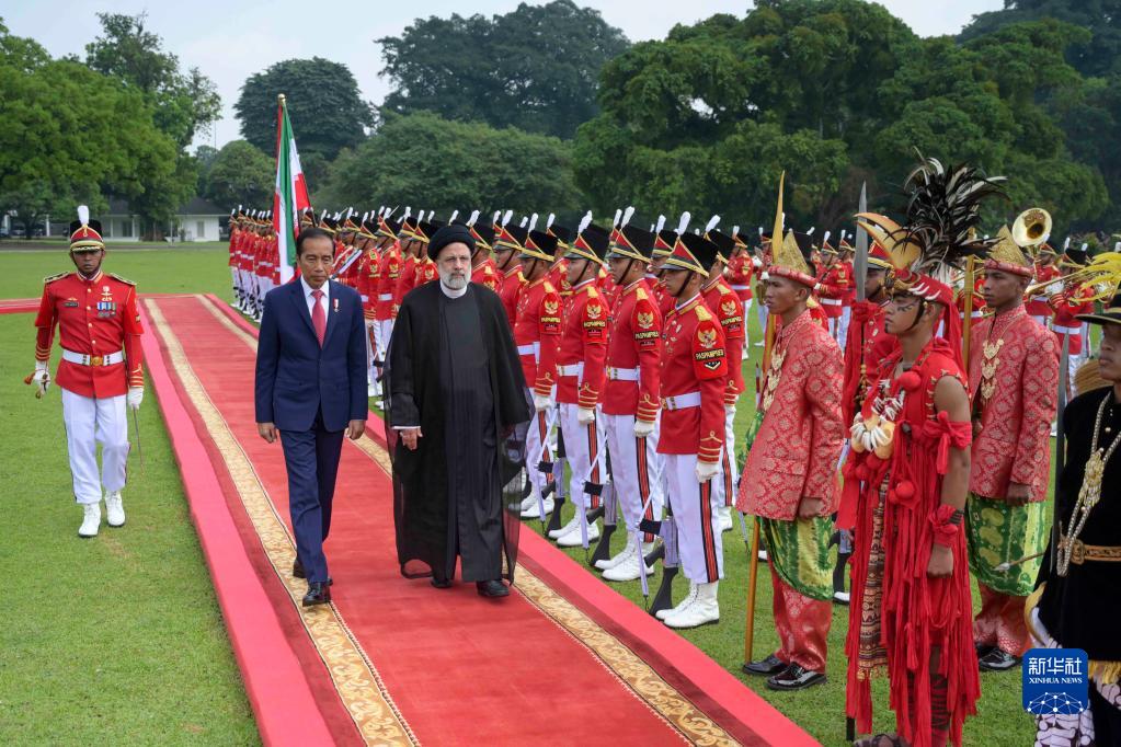 5月23日,在印度尼西亞茂物總統(tǒng)府,印尼總統(tǒng)佐科(中左)舉行儀式,歡迎到訪的伊朗總統(tǒng)易卜拉欣·萊希(中右)。