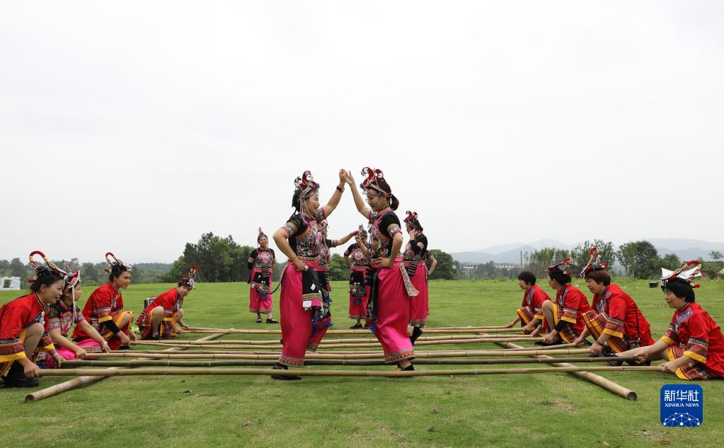 5月24日,在浙江省龍游縣浦山村,當(dāng)?shù)鼐用癖硌菝褡逄厣?jié)目。