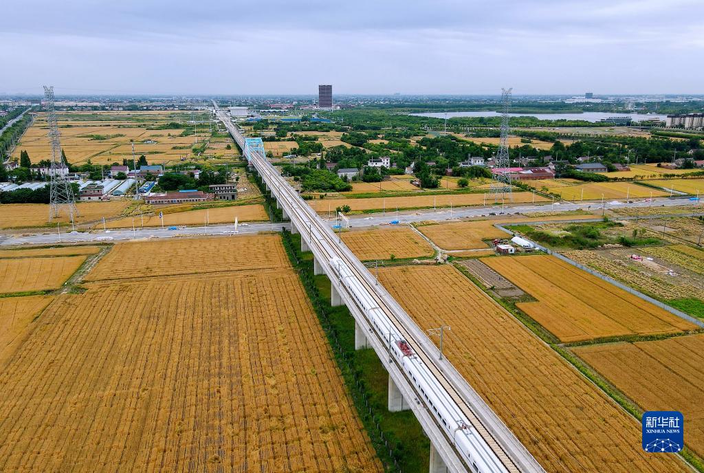 5月24日,在江蘇省如皋市城南街道新莊社區(qū),動(dòng)車組列車從金色的小麥田間駛過(無人機(jī)照片)。