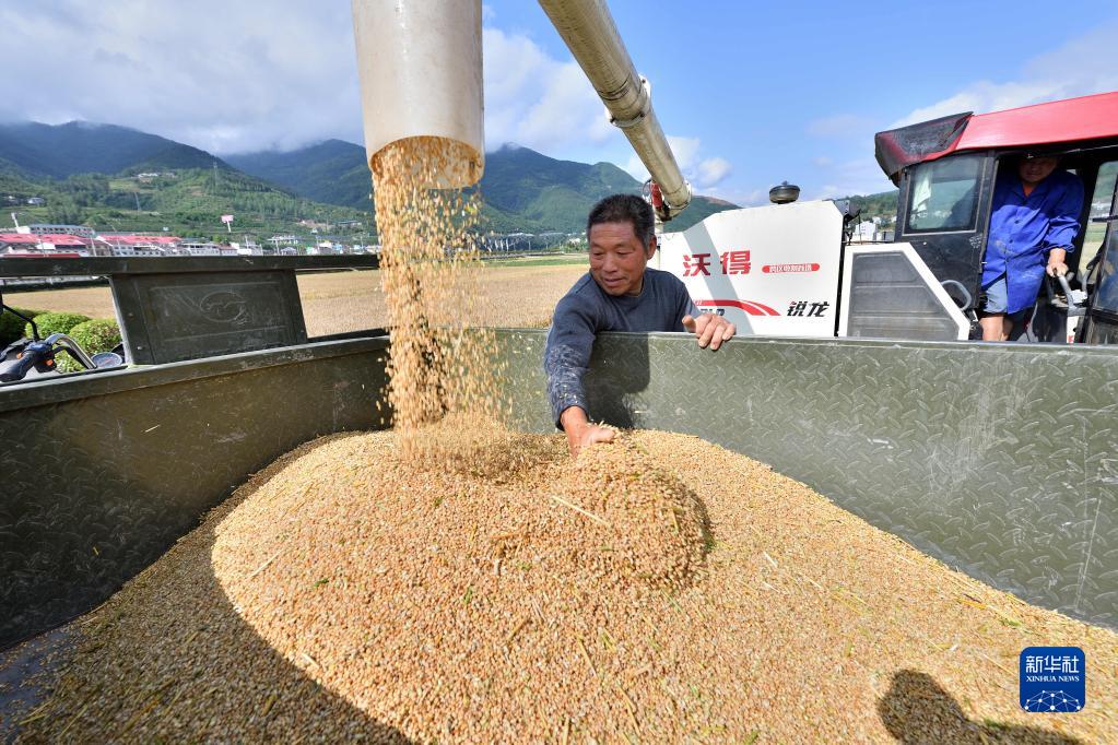 5月24日,湖北省襄陽市保康縣馬橋鎮(zhèn)中坪村的農(nóng)民在整理機(jī)收的小麥。