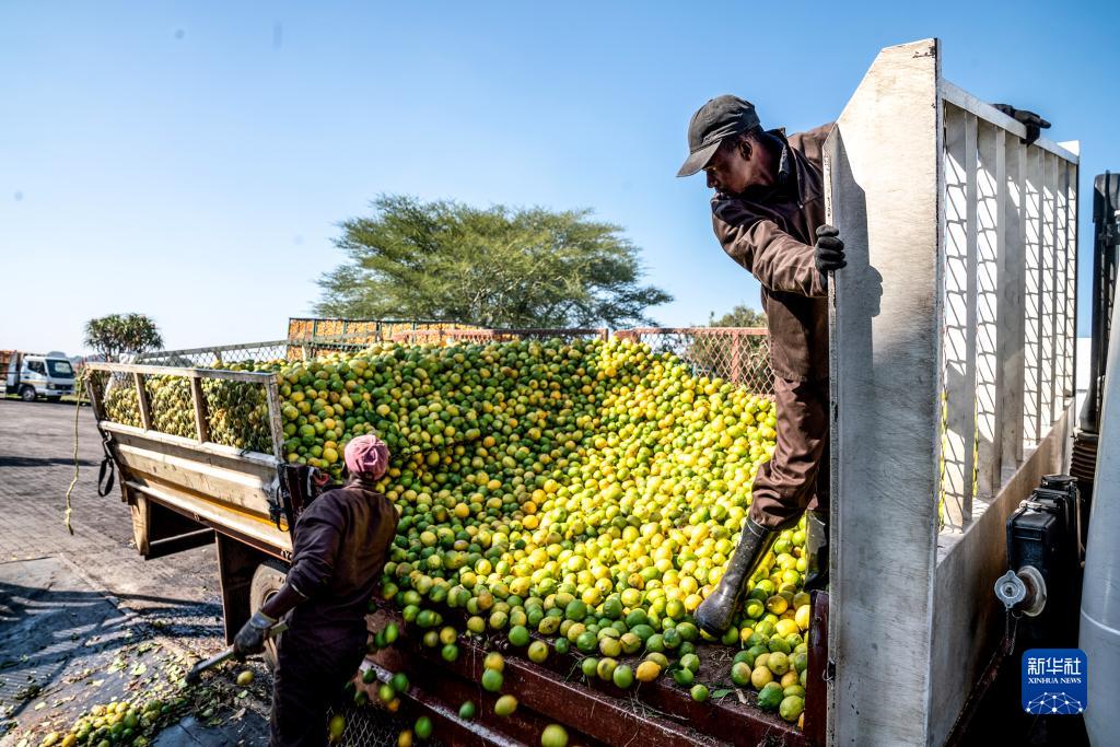 5月24日,工人在南非西北省一處榨汁工廠裝卸柑橘。