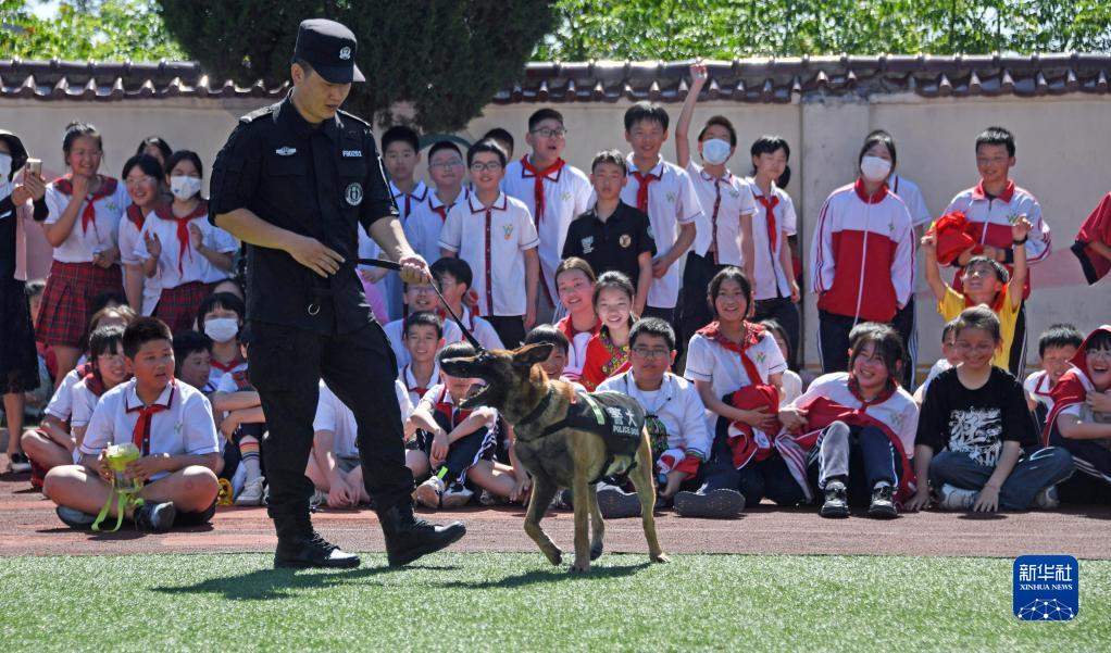 5月29日,在浙江省臺(tái)州市仙居縣第五小學(xué)舉行的“警營(yíng)開(kāi)放迎六一”活動(dòng)上,民警為學(xué)生們展示警犬協(xié)同演練。