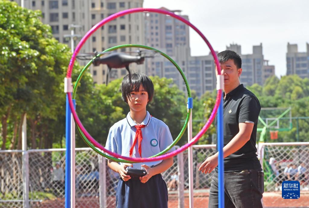 5月29日,在福建省泉州市泉港區(qū)益海實(shí)驗(yàn)小學(xué)“六一”青少年宮展演現(xiàn)場(chǎng),一名學(xué)生在表演無(wú)人機(jī)穿越障礙。