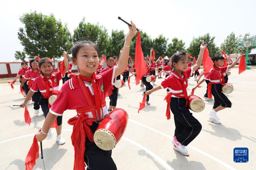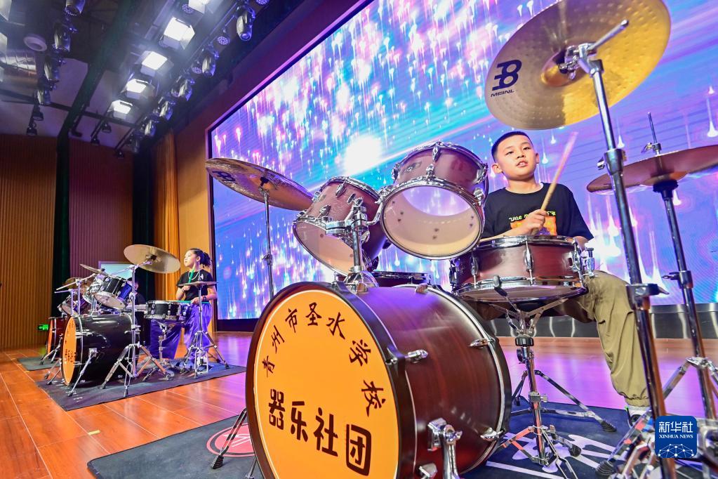5月29日,山東省青州市圣水學(xué)校器樂(lè)社團(tuán)學(xué)生在進(jìn)行架子鼓展演,迎接兒童節(jié)的到來(lái)。