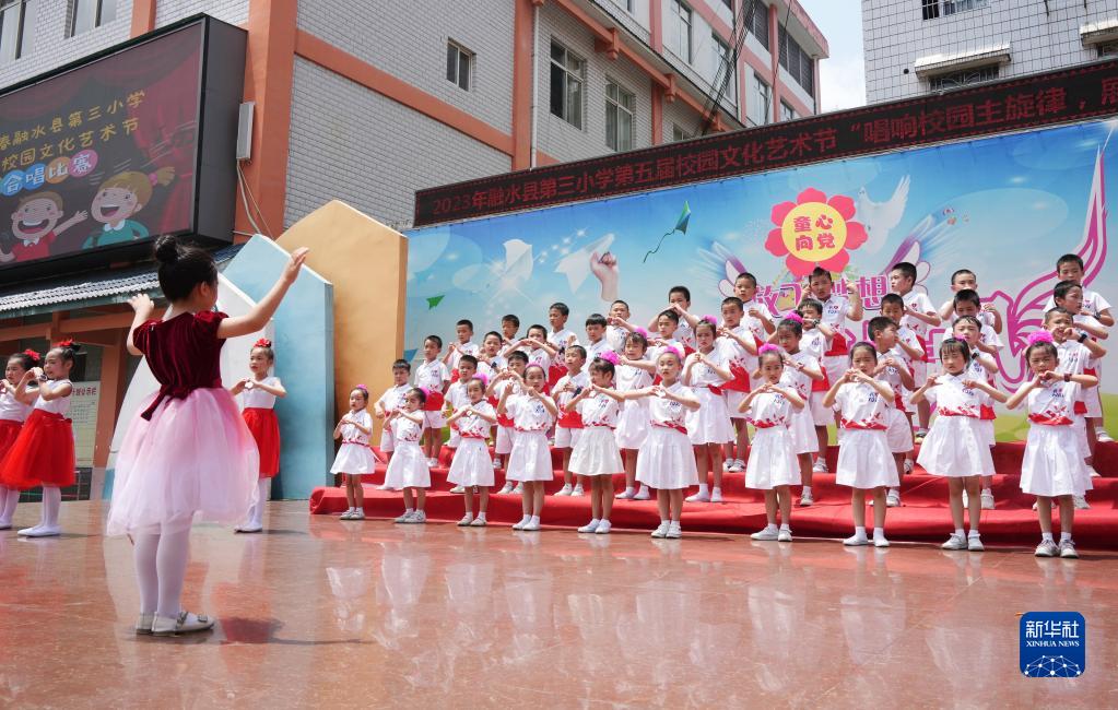 5月29日,廣西柳州市融水苗族自治縣第三小學(xué)學(xué)生在“慶六一”文化藝術(shù)節(jié)合唱比賽上演唱歌曲。