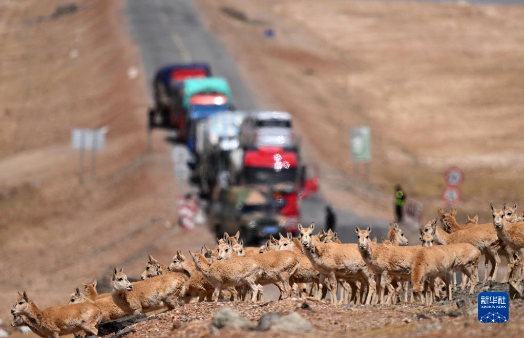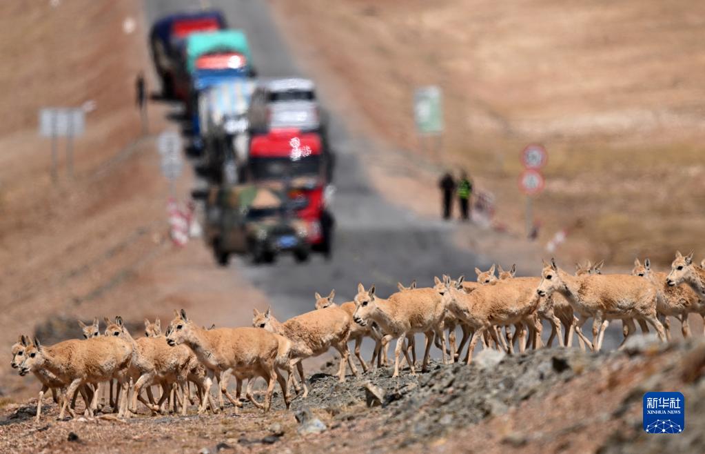 5月28日,在青海可可西里,一群雌性待產(chǎn)藏羚羊通過青藏公路。