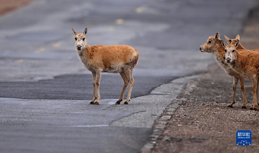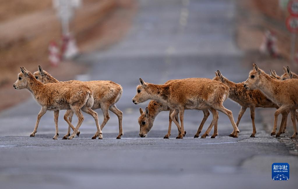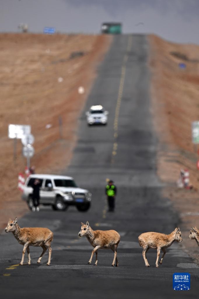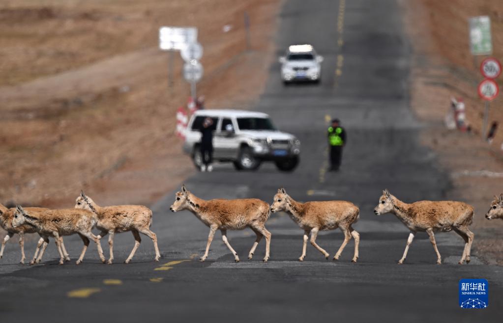 5月28日,在青海可可西里,幾只雌性待產(chǎn)藏羚羊準(zhǔn)備通過青藏公路。