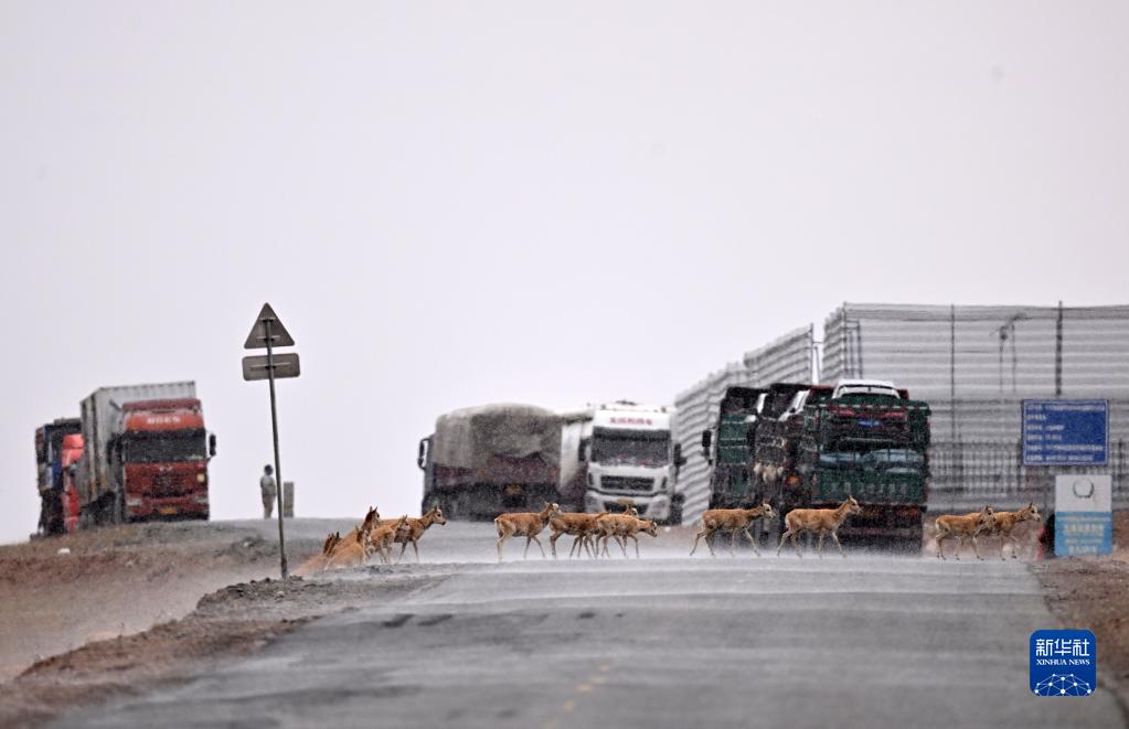 在青海可可西里,一群雌性待產(chǎn)藏羚羊在雪中通過青藏公路(5月25日攝)。