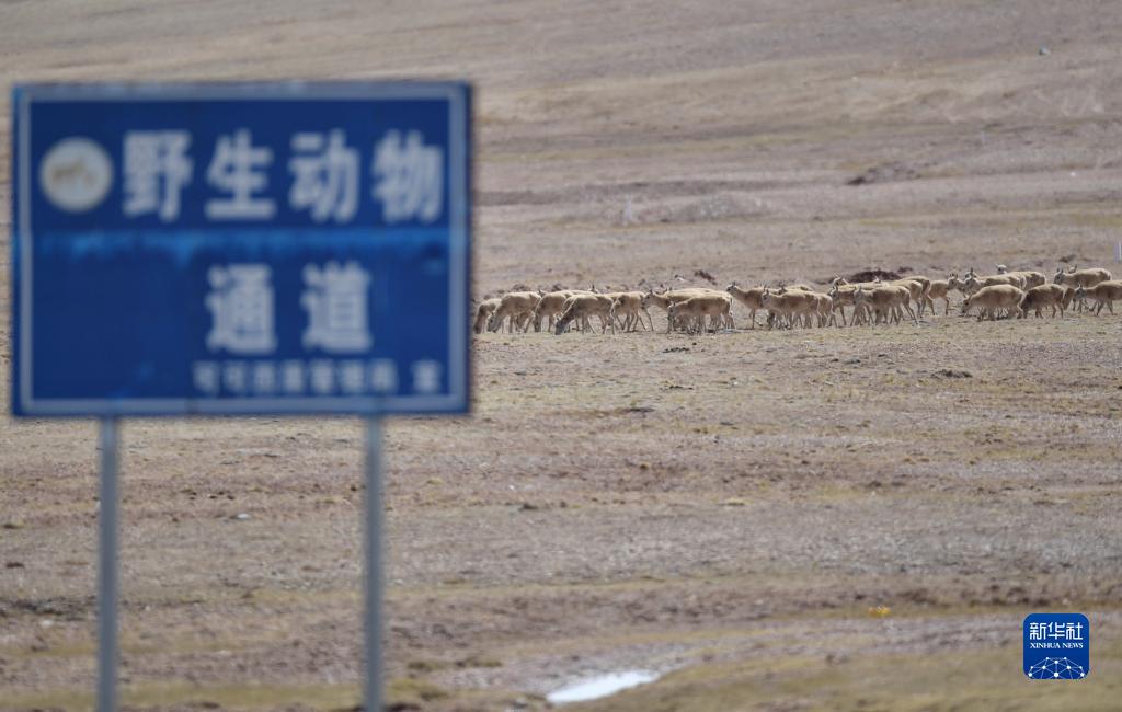 5月29日,在青海可可西里,一群雌性待產(chǎn)藏羚羊通過青藏公路后向卓乃湖行進(jìn)。