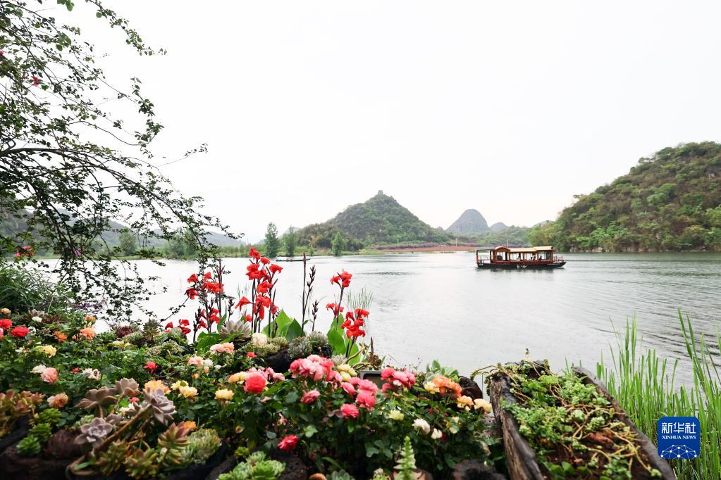 5月30日,游客乘船在普者黑景區(qū)仙人洞村游覽。