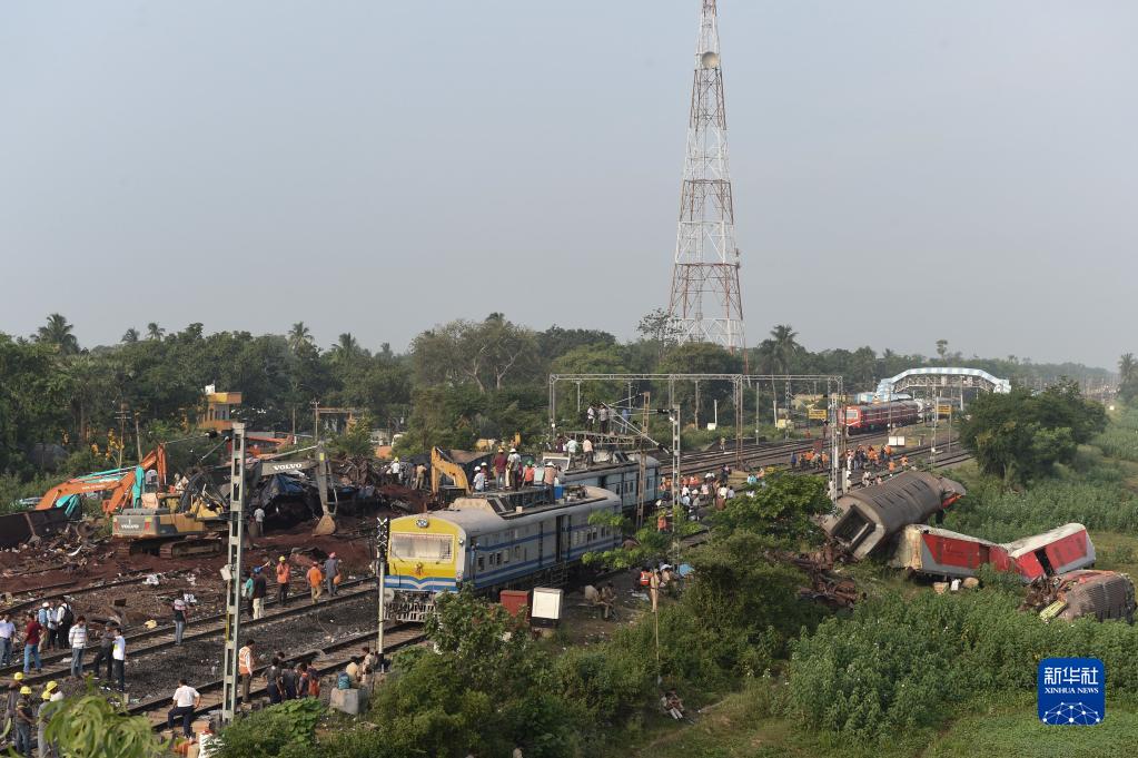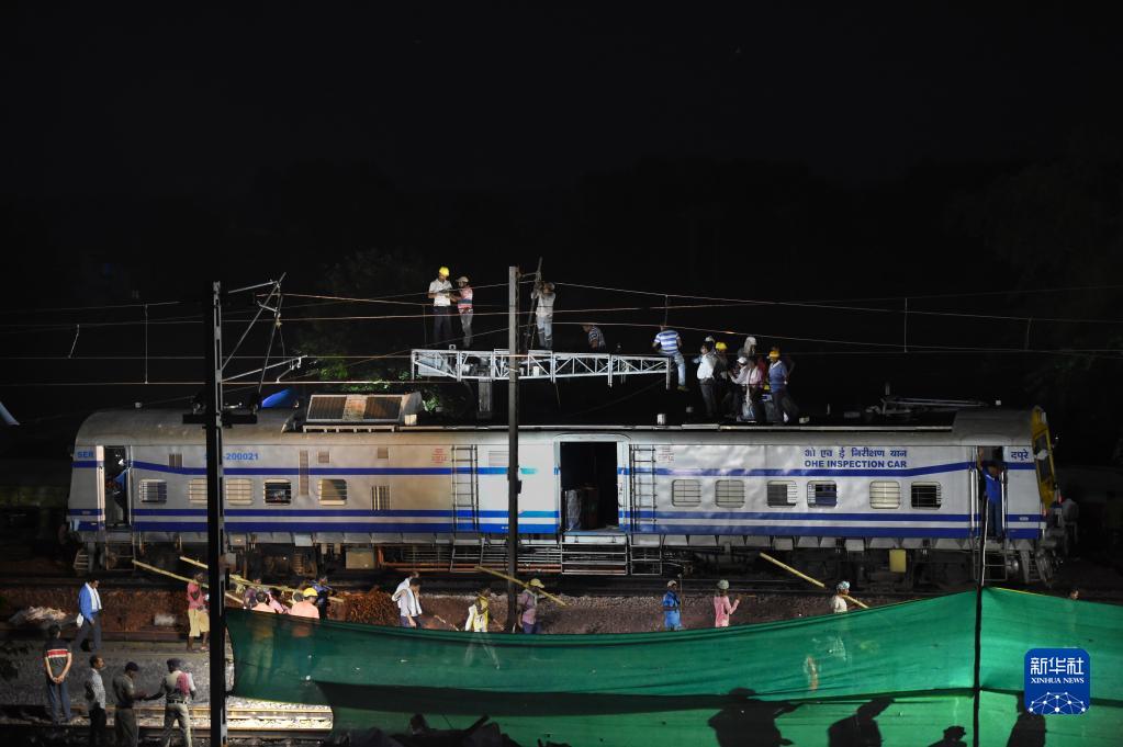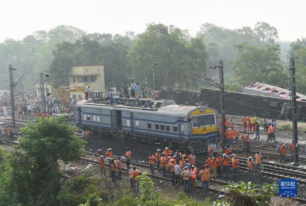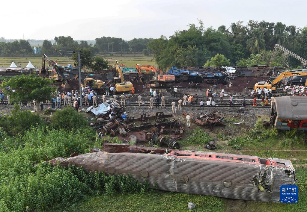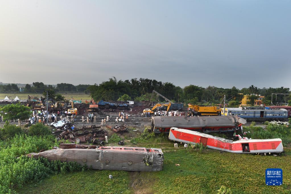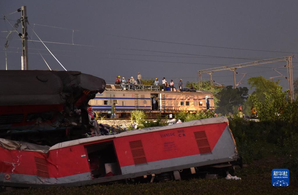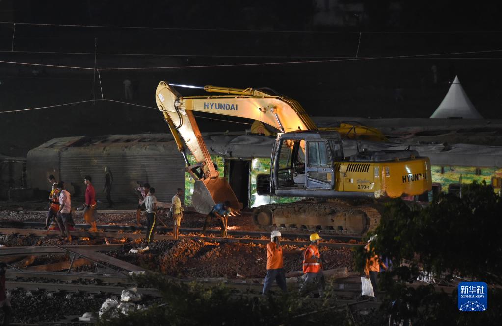 6月4日,救援人員在印度奧迪沙邦巴拉索爾地區(qū)的列車脫軌相撞事故現(xiàn)場工作。