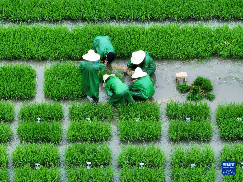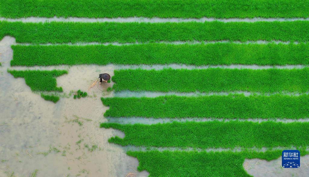 6月5日,江西省吉安市泰和縣澄江鎮(zhèn)新池村農(nóng)民在田間拋秧。