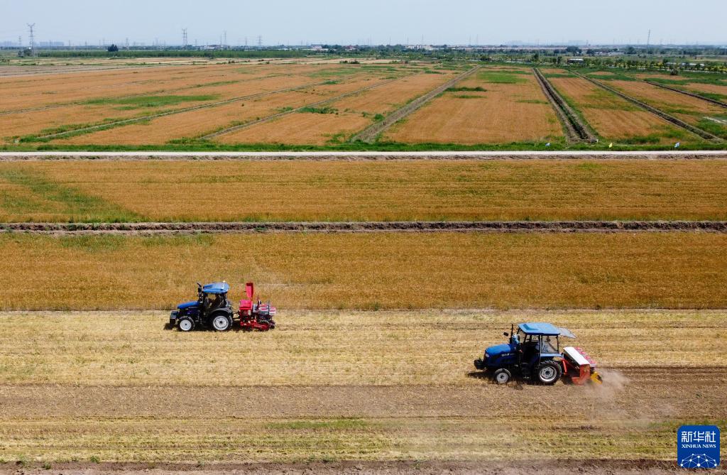 6月11日,在天津市靜海區(qū)蔡公莊鎮(zhèn),農(nóng)機(jī)在收割完小麥的土地上進(jìn)行玉米播種(無(wú)人機(jī)照片)。