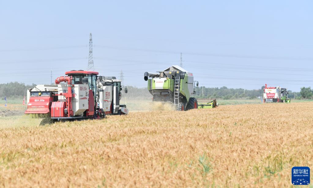 6月11日,在天津市靜海區(qū)蔡公莊鎮(zhèn),農(nóng)機(jī)在收割小麥。