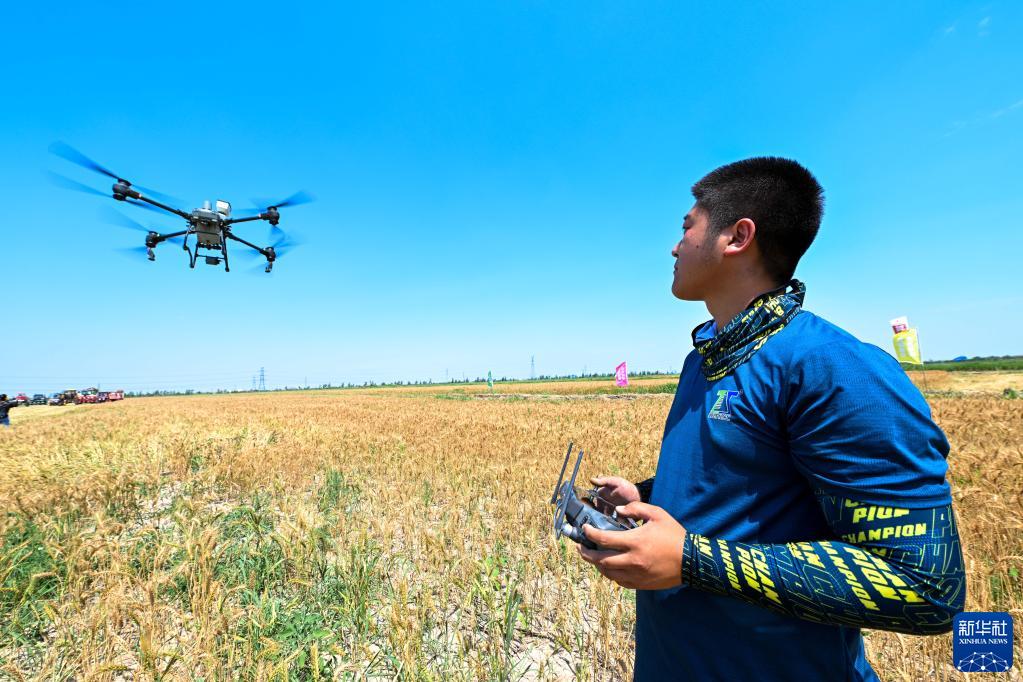 6月11日,在天津市靜海區(qū)蔡公莊鎮(zhèn),技術(shù)人員操作植保無(wú)人機(jī)。