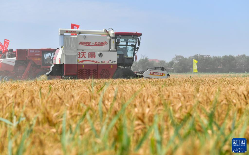 6月11日,在天津市靜海區(qū)蔡公莊鎮(zhèn),多臺(tái)農(nóng)機(jī)進(jìn)行小麥機(jī)收減損比賽。