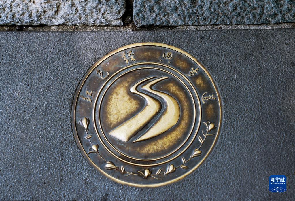 6月9日,在上海市黃浦區(qū)的道路上拍攝的“紅色經(jīng)典步道”標識。通過這條步道,市民游客以中共一大會址為起點,可以漫步至周邊的多處紅色舊跡遺址,展開紅色之旅。