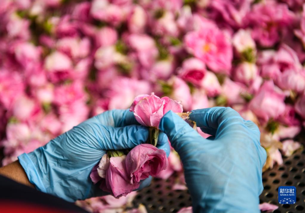 6月15日,在四川省阿壩州小金縣“金山玫瑰”基地,工人正在選花。