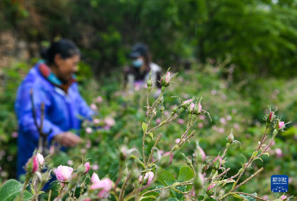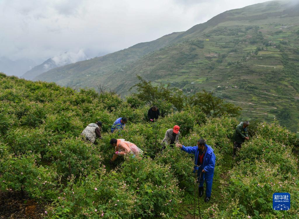 6月14日,在四川省阿壩州小金縣新橋鄉(xiāng)共和村,當?shù)胤N植戶在采摘玫瑰鮮花。