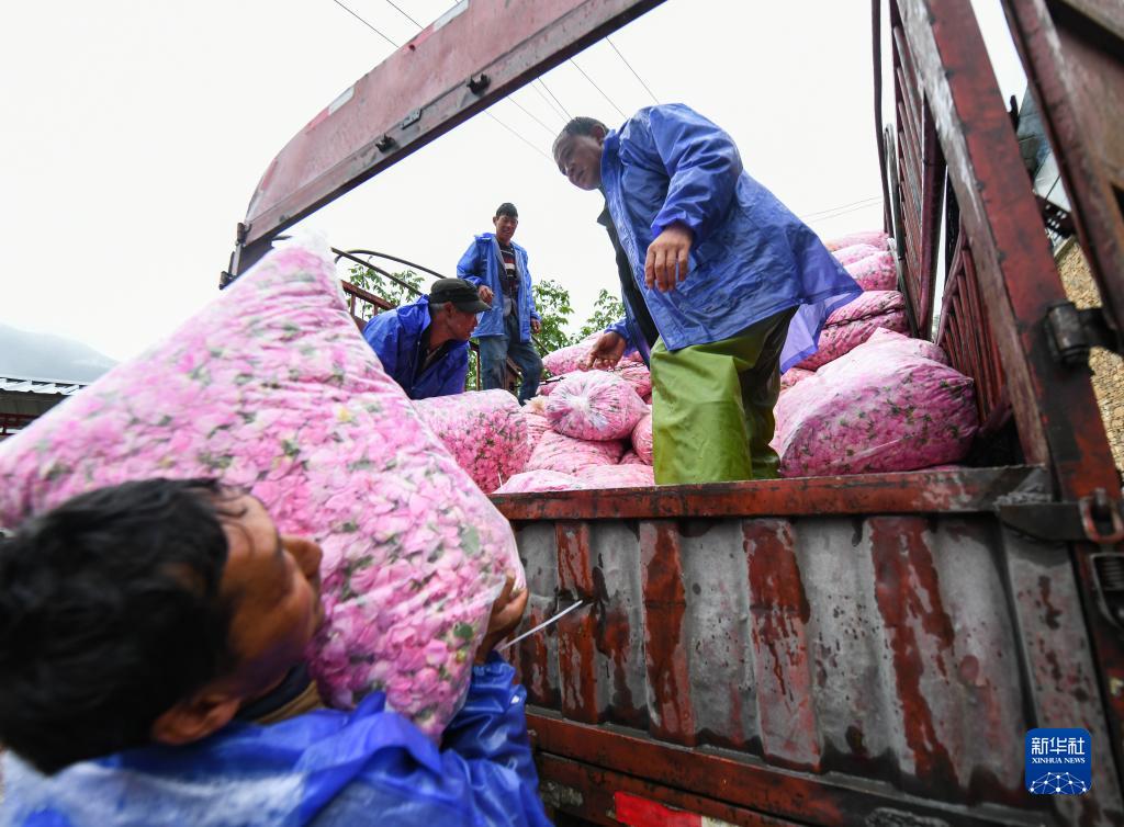 6月14日,在四川省阿壩州小金縣新橋鄉(xiāng)共和村,“金山玫瑰”基地的工作人員在收購當?shù)胤N植戶的玫瑰鮮花。