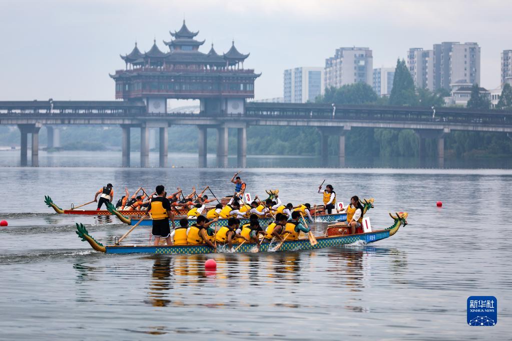 6月18日,龍舟隊在安徽省黃山市屯溪區(qū)新安江水域上展開角逐。