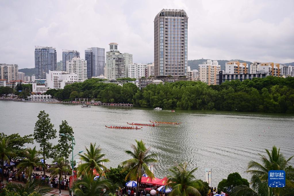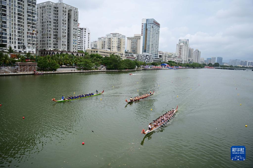 6月18日,龍舟隊在海南省三亞市三亞河上進行比賽。