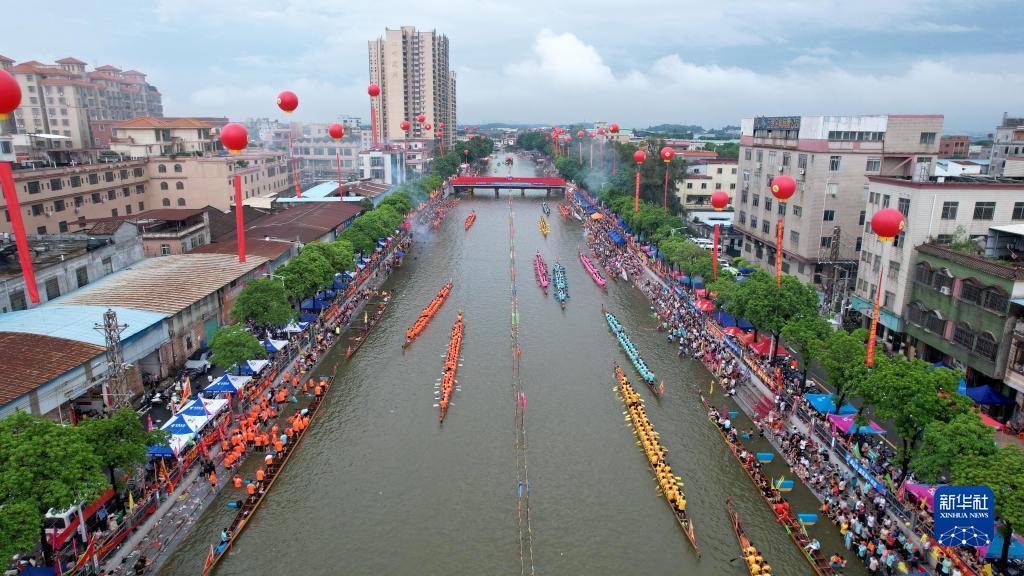 6月18日,龍舟隊在廣東省肇慶市高要區(qū)金利鎮(zhèn)西圍涌參賽(無人機照片)。