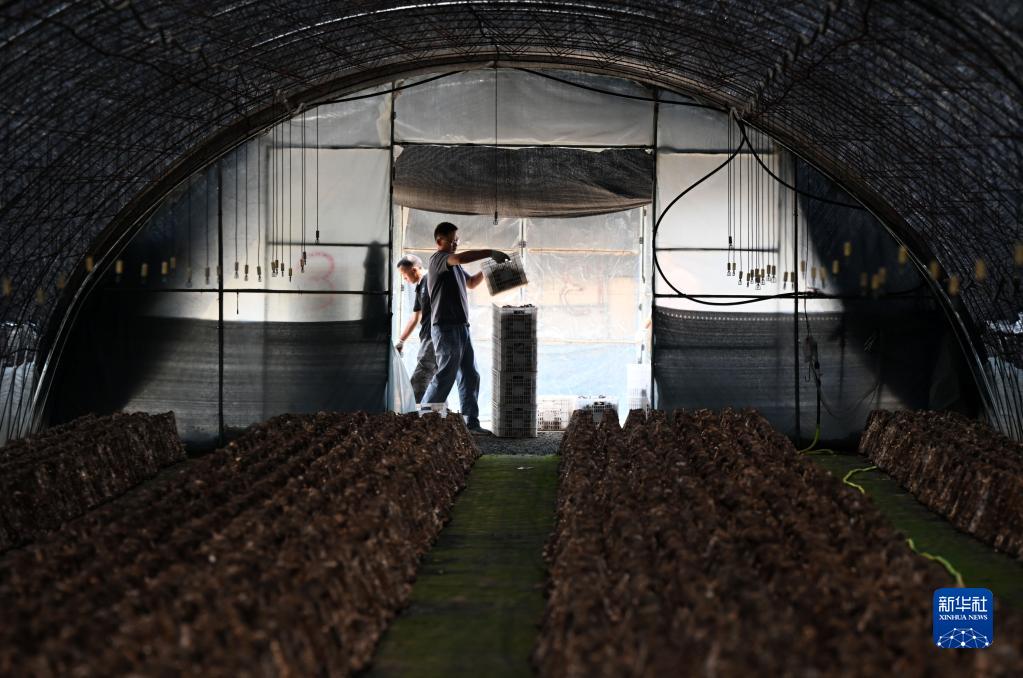 6月26日,農(nóng)民在隆化縣章吉營(yíng)鎮(zhèn)一處食用菌大棚搬運(yùn)香菇。