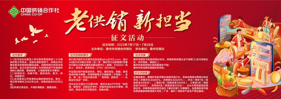 征文活動(dòng)由惠州市供銷合作聯(lián)社主辦,惠州日?qǐng)?bào)社承辦。根據(jù)征文要求,要結(jié)合全面貫徹黨的二十大精神開局之年特點(diǎn),反映在黨的領(lǐng)導(dǎo)下,供銷合作社建設(shè)事業(yè)所取得的矚目成就,回顧供銷社的歷史成就點(diǎn)滴,征文內(nèi)容為投稿人與供銷系統(tǒng)產(chǎn)生情感共鳴的心路歷程、情感故事、心情隨筆等文字素材,