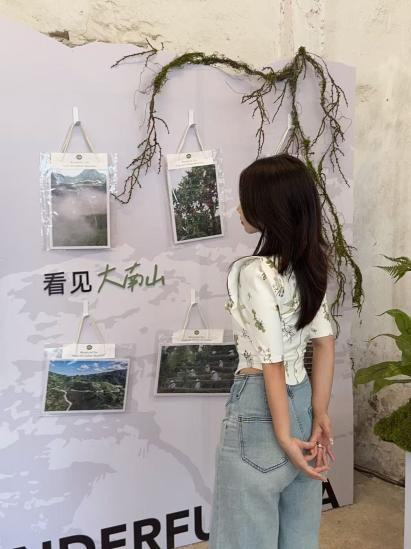步入野島生活社區(qū)的快閃空間,首先映入眼簾的是一面由茶樹枝與定格了南山風采面面、照片組成的 “記憶墻”。樹枝來自海拔 600 米的大南山茶園,每一道紋理都記錄著嶺南季風的吹拂;電視里正循環(huán)播放著茶山四季的流轉(zhuǎn) —— 春有新綠破土、夏見云霧漫坡、秋遇豐收的果實、冬觀霜露凝枝,茶與土地的羈絆在此隨光影流動,更顯鮮活。