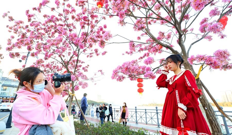 1月31日,在冬日暖陽下,陸陸續(xù)續(xù)有市民來打卡,邂逅浪漫的紫花風(fēng)鈴。走近紫花風(fēng)鈴木,只見滿樹枝頭都是一簇簇紫紅色的花朵,整株樹幾乎沒有葉片,猶如編織了一個紫色的風(fēng)鈴。漫步其中,讓人在冬天里享受春天的感覺。