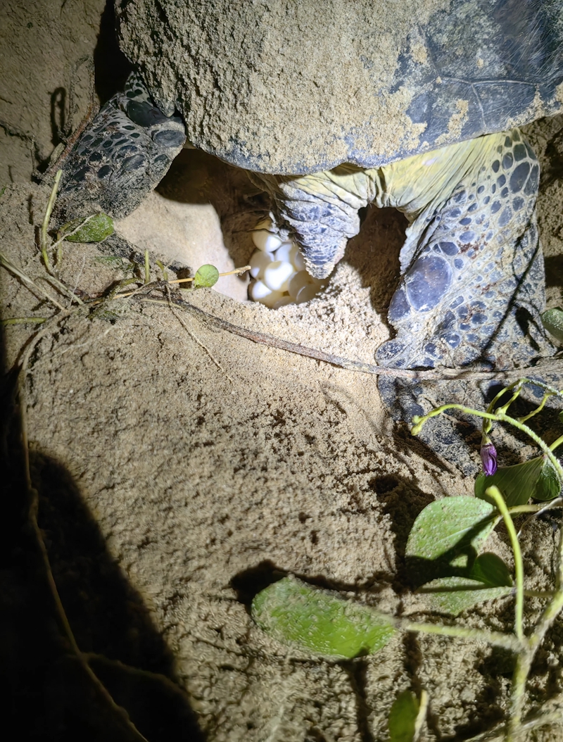 當(dāng)天凌晨,母海龜從海里悄悄爬上沙灘,用健壯的四肢在沙灘上挖了個(gè)坑,趴著產(chǎn)下一窩龜?shù)昂笥峙老蚝@铮?時(shí)30分消失在浪潮里。