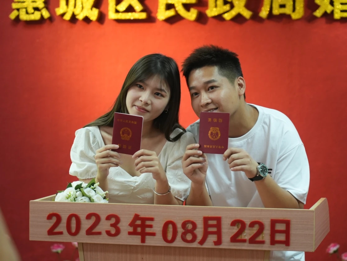 呂先生和劉小姐領到結婚證,曬出“小紅本”,開心地在鏡頭前做出心型的手勢。“我特意選了七夕這個美好的日子和女友前來領證。”新人呂先生和大家一起分享“甜蜜”。他和女友是研一時開始談戀愛的,研究生畢業(yè)后一起通過人才引進的方式來到惠州工作安家,“我們都是北方人,在這里相互依靠建起小家。”劉小姐滿眼幸福地告訴記者,她和呂先生經過六七年的戀愛,共同經歷了人生中的求學奮斗時光,最讓她感動的是疫情期間的一次經歷,“他當時身體很不舒服,我發(fā)熱了,他還半夜里背著我去醫(yī)院,他是一個很有責任感的人。”