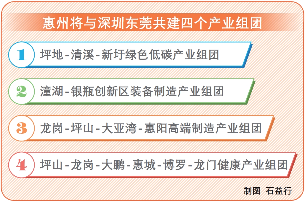 《深圳都市圈發(fā)展規(guī)劃》提出,要高質(zhì)量建設(shè)跨區(qū)域產(chǎn)業(yè)組團。對此,《方案》還明確惠州將與深圳、東莞共建四個組團,分別為坪地-清溪-新圩綠色低碳產(chǎn)業(yè)組團、潼湖-銀瓶創(chuàng)新區(qū)裝備制造產(chǎn)業(yè)組團、龍崗-坪山-大亞灣-惠陽高端制造產(chǎn)業(yè)組團、坪山-龍崗-大鵬-惠城-博羅-龍門健康產(chǎn)業(yè)組團,并提出了具體建設(shè)目標。