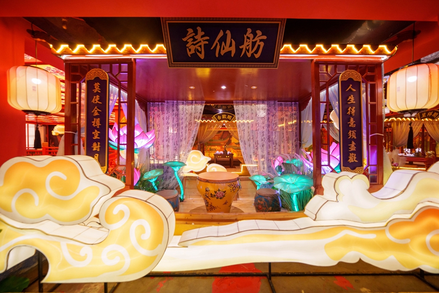 一樓,身著唐朝服飾的姑娘們正翩翩起舞,等餐的食客或忙于游園、投壺,或忙于逛市集,或忙于與李白對酒當(dāng)歌,又或忙于和皇帝貴妃一同翩然起舞,他們在大堂里穿梭,在大唐尋夢。二樓,有食客立于樓閣之上,在現(xiàn)實(shí)與夢境之間,看大唐盛世、輕歌曼舞。酒過三巡,酒宴將息,食客紛紛離席,有的潛入流光溢彩的亭臺樓閣之中,有的穿行于鱗次櫛比的攤位之間,與唐朝“名家”及盛唐文化一一邂逅,讓“眼耳鼻舌身意”六感都沉浸其中,幻化出一個淵然而深妙的感官意境。驚鴻一瞥,皆是詩意的盛唐場景。