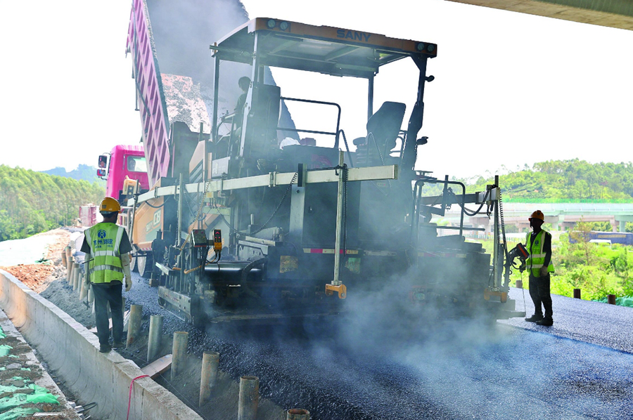 惠龍高速平陵互通路段,工人忙著鋪設(shè)瀝青。惠州日報記者李松權(quán) 攝