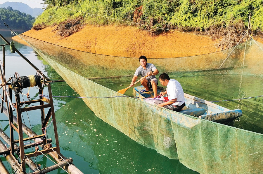 黃偉勝(右)與課題組團(tuán)隊(duì)在天堂山九牛圳野采銀魚(yú)。