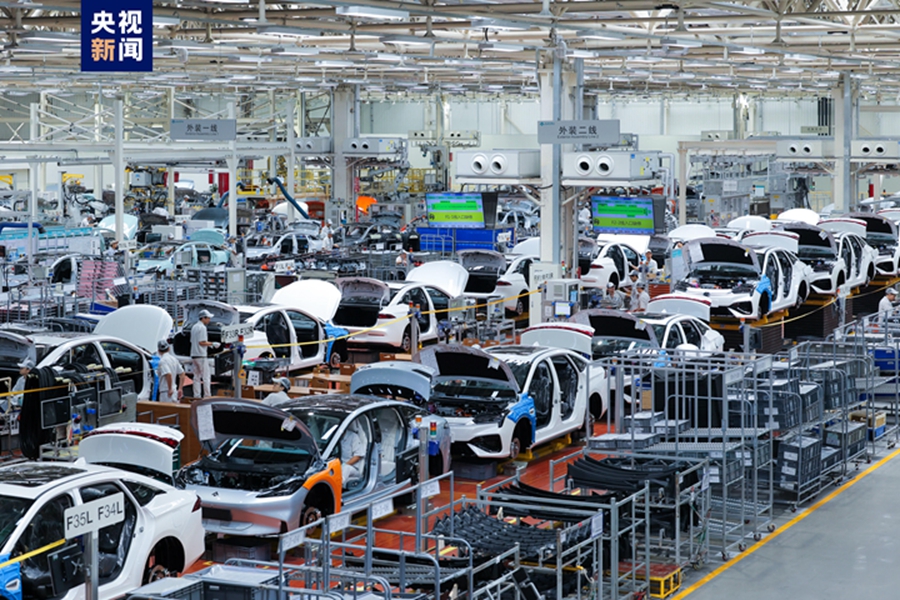 △全國每4輛新能源汽車就有1輛是“廣東造” 圖為廣汽埃安新能源汽車生產(chǎn)線